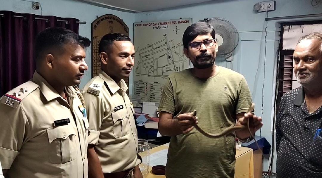 गुरुवार की सुबह डेलीमार्केट थाना अंतर्गत न्यू डेलीमार्केट के हाजी मो0 हासिम के इलेक्ट्रॉनिक्स दुकान में एक सांप घुस गया। जिससे मार्किट में अफरातफरी का माहौल उतपन्न हो गया। हाजी मो हासिम द्वारा तुरंत इसकी सूचना थाना प्रभारी मधुसूदन मोदक को दिया गया गया। थाना प्रभारी मोदक ने डी०एफ०ओ० राँची के माध्यम से तत्काल इस संबंद में वाइल्डलाइफ कंसर्वशनिस्ट रमेश कुमार महतो से संपर्क कर सांप पकड़ने हेतु संपर्क किया। परंतु वाइल्डलाइफ कंसर्वशनिस्ट के आने के पहले ही स्थानीय युवक मो0 सोनू एवं सूरज राम ने सांप को जिंदा पकड़ लिया !