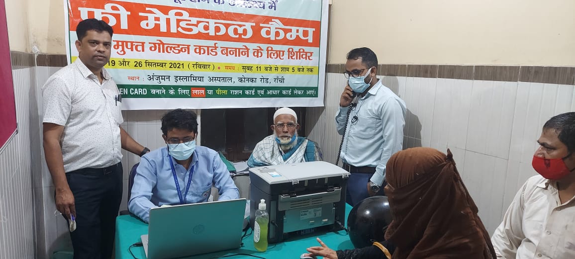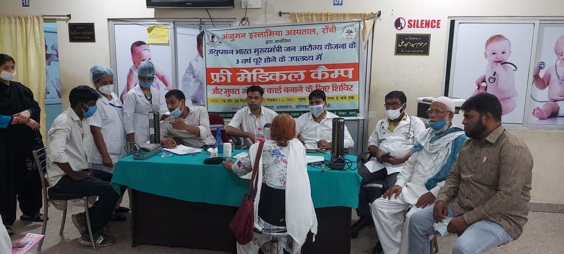 राजधानी रांची के कोंनका रोड़ पर स्थित अंजुमन इस्लामिया अस्पताल में आज 19 सितंबर 2021 को निशुल्क स्वास्थ्य शिविर का आयोजन किया गया। यह आयोजन आयुष्मान भारत मुख्यमंत्री जन आरोग्य योजना के 3 वर्ष पूर्ण होने के उपलक्ष्य में आयुष्मान भारत पखवाड़े के तहत अंजुमन इस्लामिया अस्पताल में निशुल्क स्वास्थ्य कैंप लगाया गया और गोल्डन कार्ड भी बनाया गया। साथ ही आए हुए लोगों को योजना से संबंधित जानकारी दी गई। अंजुमन अस्पताल के प्रमुख स्थानों पर योजना से संबंधित पोस्टर बैनर प्रदर्शित किए गए। लोगों को ज्यादा से ज्यादा फायदा पहुंचे इसके लिए अस्पताल प्रबंधन के द्वारा मस्जिदों से एलान कराया गया।