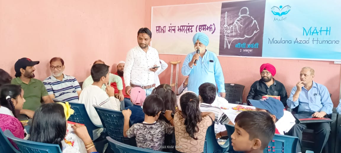 मौलाना आजाद ह्यूमेन इनिशिएटिव व साझा मंच झारखंड के संयुक्त तत्वाधान में गाँधी जयंती के शुभ अवसर पर दो कार्यक्रम दो सत्र में आयोजित किये गये। पहले सत्र में स्लम क्षेत्र के बच्चों के बीच “गाँधी को जानें” के विषय पर एक क्विज़ प्रतियोगिता का आयोजन किया गया जिसमें लगभग 5 से 13 वर्ष के 50 बच्चों ने हिस्सा लिया। गाँधी की जीवनी और उनके स्वतंत्रता संग्राम में योगदान को लेकर कई प्रश्न पूछे गए, बहुत सारे बच्चों ने पूछे गए सवालों का उत्साह पूर्वक सही जवाब दिए और पुरुष्कार के हक़दार बने। क्विज़ प्रतियोगिता में शामिल बच्चों में काफ़ी उत्साह देखा गया। बड़ी संख्या में छोटी बच्चियों ने भी दिलचस्पी दिखाई और गाँधी से संबंधित सवालों के जवाब दिए। आज जबकि गाँधी के विचार कहीं अधिक प्रासंगिक है, ऐसे में बच्चों को उनके विचार से परिचय कराना धर्मनिरपेक्ष भारत और परस्पर सद्भाव के लिए अनिवार्य हो गया है। क्विज़ प्रतियोगिता का संचालन मोहम्मद इक़बाल ने किया। क्विज़ प्रतियोगिता के पूर्व इन्होंने बच्चों के समक्ष सरल शब्दों में गाँधी की जीवनी को रखा।
