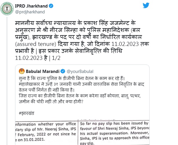 बाबूलाल मरांडी के ट्वीट करने के कुछ ही देर बाद झारखंड पीआरडी की तरफ से भी एक ट्वीट किया गया. जिसमें यह लिखा गया है कि माननीय सर्वोच्च न्यायालय के प्रकाश सिंह जजमेंट के अनुसार राज्य के डीजीपी नीरज सिन्हा को पुलिस महानिदेशक झारखंड के पद पर 2 वर्षों का निर्धारित कार्यकाल दिया गया है, जो दिनांक 11 फरवरी 2023 तक प्रभावी है. पीआरडी की तरफ से यह भी लिखा गया है कि ऐसी ही व्यवस्था बिहार समेत कई अन्य राज्यों में लागू है और झारखंड के डीजीपी नीरज सिन्हा को अप्रैल 2022 तक का वेतन का भुगतान हो चुका है.