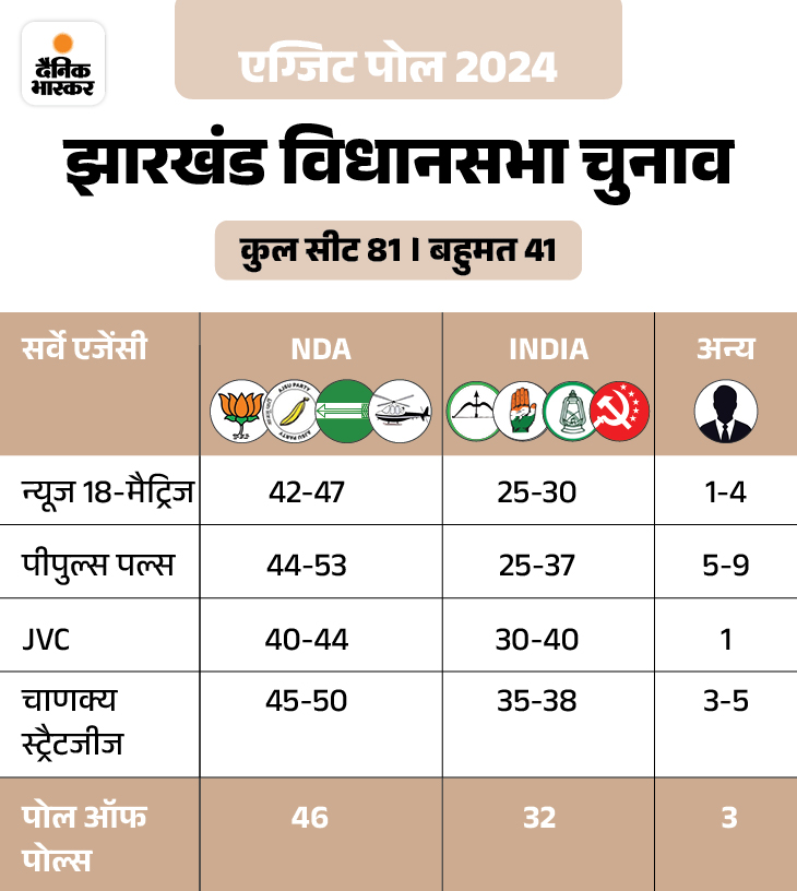 एग्जिट पोल के मुताबिक, झारखंड में भाजपा गठबंधन को 42 से 47 सीटें मिलने का अनुमान लगाया गया है. वहीं, झारखंड मुक्ति मोर्चा (जेएमएम) के नेतृत्व वाले इंडिया ब्लॉक को 25 से 30 सीटें जीतने का दावा किया गया है, जबकि अन्य के खाते में 1 से 4 सीट जाने का अनुमान लगाया गया है. वहीं, Peoples Pulse ने भी अपने एग्जिट पोल में NDA को 44-53 सीटें दी है तो वहीं इंडिया गठबंधन को 25-37 सीटें दी है.