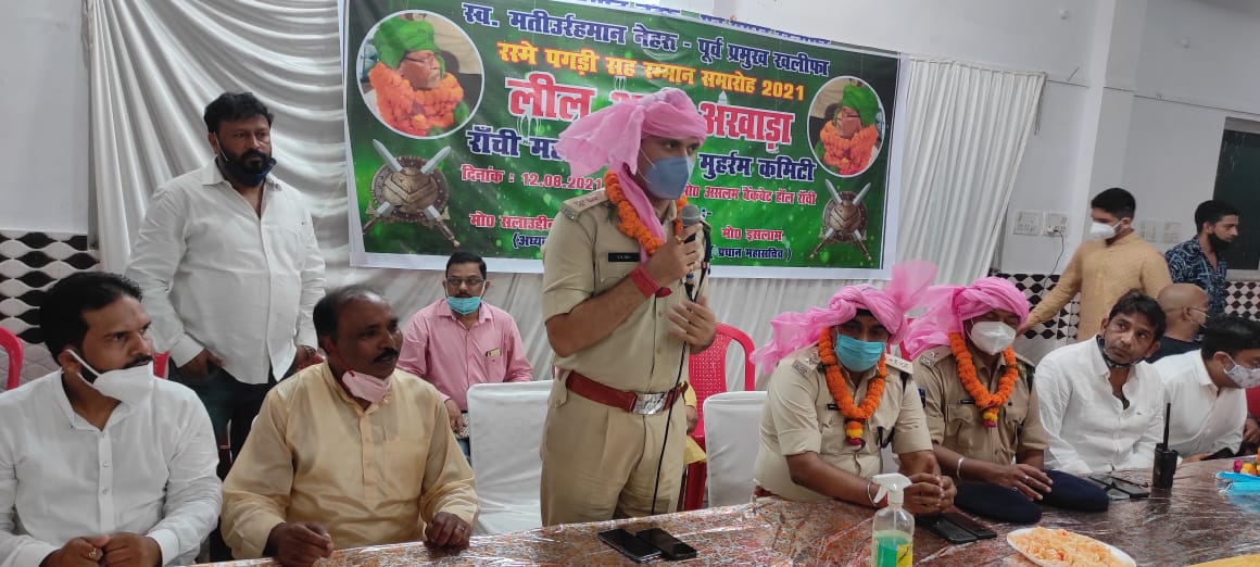उपाध्यक्ष मासूम गद्दी, मोहम्मद अली, सेन्ट्रल मुहर्रम कमिटी के महासचिव अकीलुर्रहमान,जे एम एम के महुआ मांझी ,जिला अध्यक्ष मो.मुश्ताक, दीपक ओझा सहित लीलू अली अखाड़ा के अन्तर्गत आने वाले तमाम क्षेत्रीय खलीफा एवं पदाधिकारी सहित अनेक गणमान्य लोगों को पगड़ी एवं माला पहनाकर सम्मानित किया गया ।उक्त अवसर पर मुख्य अतिथि के रूप में एस एस पी रांची श्री सुरेन्द्र कुमार झा ने अपने सम्बोधन में पैगम्बर मोहम्मद साहब सहित कर्बला की तारीख पर विस्तार से चर्चा करते हुए उनके आदर्शों एवं उसूलों पर चलने की सभी से अपील की तथा एकता एवं भाईचारे के साथ मिलकर सरकारी गाईडलाईन का पालन करते हुए मुहर्रम के त्योहार को मनाने की बात कही।उन्होंने मुहर्रम की विशेषता पर प्रकाश डालते हुए कहा कि मुहर्रम त्याग एवं बलिदान पर आधारित पर्व है तथा इस पर्व को पैगम्बर मोहम्मद साहब के खानदान की कुर्बानी को याद कर मनाया जाता है तथा इस पर्व से हमें हर स्तर पर त्याग एवं बलिदान की सीख मिलती है ।
