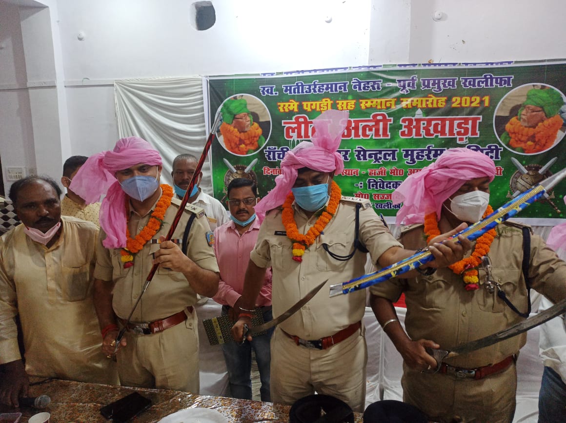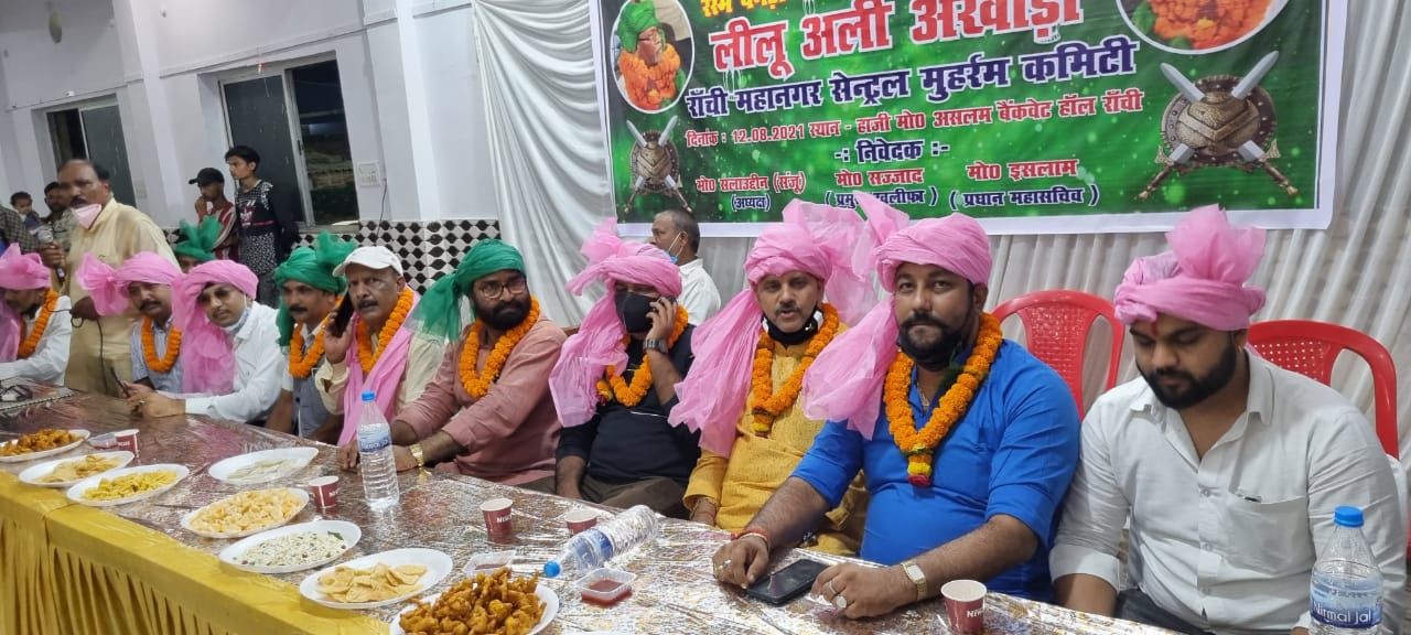 लीलू अली अखाड़ा एवं रांची महानगर सेन्ट्रल मुहर्रम कमिटी के संयुक्त तत्वावधान में प्रमुख खलीफा मोo सज्जाद, रांची महानगर सेन्ट्रल मुहर्रम कमिटी के अध्यक्ष मोo सलाउद्दीन एवं रांची महानगर सेन्ट्रल मुहर्रम कमिटी के प्रधान महासचिव मोoइसलाम के नेतृत्व में आयोजित रस्मे पगड़ी सम्मान समारोह कार्यक्रम में मुख्य अतिथि के रूप में एस एस पी रांची श्री सुरेन्द्र कुमार झा ,विशिष्ट अतिथि मुख्य रूप में ,सिटी डी एस पी श्री दीपक कुमार,पु.नि.सह थाना प्रभारी लोअर बाजार श्री संजय कुमार, श्री महाबीर मंडल रांची के अध्यक्ष जय सिंह यादव,महुआ मांझी, समनूर मंसूरी, नंदकिशोरचंडेल, रंजन कुमार, सागर कुमार ,धवताल अखाड़ा के प्रमुख खलीफा पप्पू गद्दी, इमाम बख्श अखाड़ाके प्रमुख खलीफा मो.महजूद, रांची महानगर सेंट्रल मुहर्रम कमिटी के अध्यक्ष जावेद गद्दी,