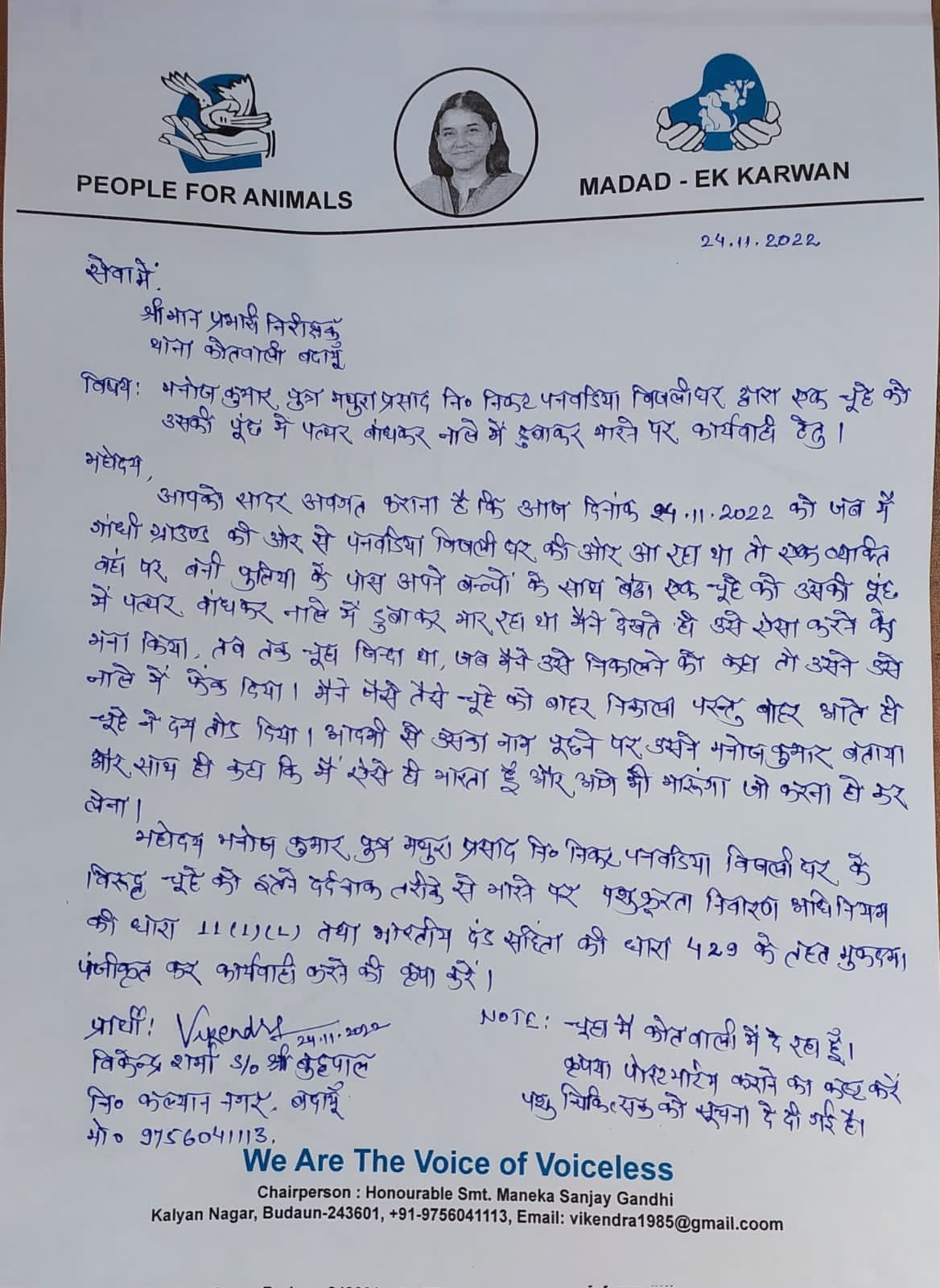 यह देख वह उसके पास गए और ऐसा करने से मना किया। इस पर उस युवक ने पत्थर सहित चूहे को नाले में फेंक दिया। इस पर विकेंद्र ने नाराजगी जताते हुए उसका नाम पूछा तो उसने अपना नाम मनोज कुमार बताया। चूहे को नाली से निकालने को कहा तो वह लड़ने पर अमादा हो गया। इस पर विकेंद्र खुद नाले में उतरे और चूहे को बाहर निकाला। लेकिन बाहर रखने के कुछ देर बाद ही चूहे ने दम तोड़ दिया।