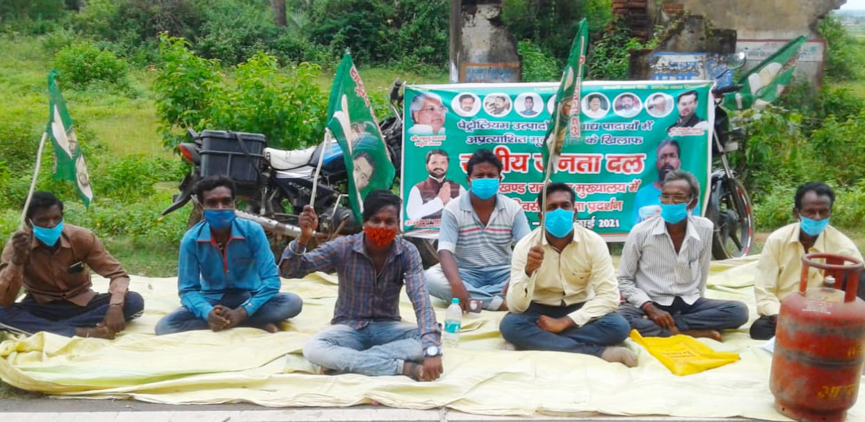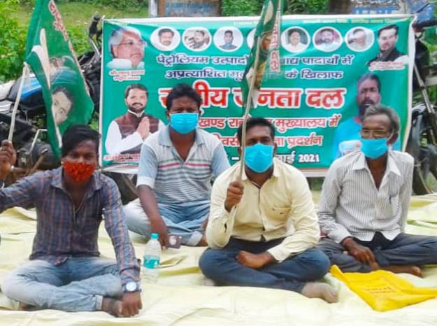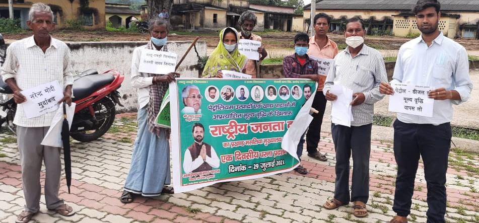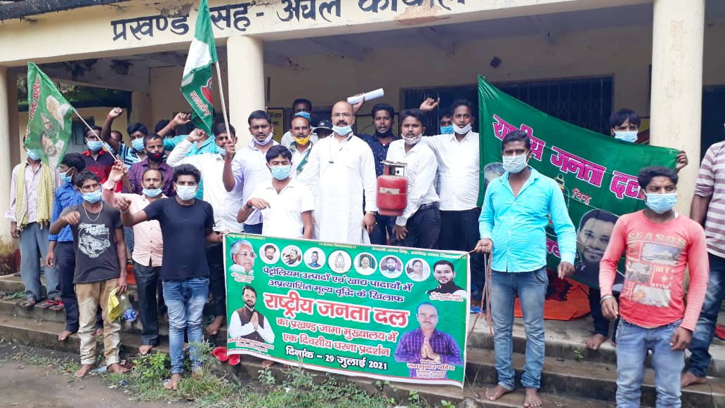 राष्ट्रीय जनता दल प्रखंड अध्यक्ष लक्ष्मी नारायण रावत के अध्यक्षता में प्रखंड मुख्यालय मैं एक दिवसीय धरना प्रदर्शन का कार्यक्रम आयोजित किया गया कार्यक्रम में मुख्य रूप से प्रखंड प्रभारी आदित्य नंदन मौजूद थे सभा को संबोधित करते हुए उन्होंने कहा कि केंद्र सरकार के जनविरोधी नीति के कारण देश में महंगाई चरम सीमा पर पहुंच गई है पेट्रोल डीजल और रसोई गैस खाद्यान्न की कीमत लगातार बढ़ती जा रही है महामहिम राष्ट्रपति को प्रेषित ज्ञापन प्रखंड विकास पदाधिकारी को सौंपते हुए मांग किया गया है कि पेट्रोलियम पदार्थों एवं खाद्यान्नों की कीमत वापस किया जाए कार्यक्रम में कुमार,निखिल कुमार, प्रेमनंदन महतो, सावित्री देवी, श्याम सुन्दर महतो सहित कई कार्यकर्ता मौजूद थे।