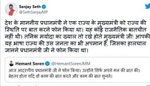 प्रधानमंत्री नरेंद्र मोदी ने झारखंड के मुख्यमंत्री हेमंत सोरेन को राज्य में कोरोना की स्थिति को लेकर फोन किया था. हेमंत सोरेन ने स्वयं ट्वीट कर इसकी जानकारी दी है. इसमें सीएम ने पीएम पर तंज कसा है. इससे भाजपा भड़क गयी है और आरोप-प्रत्यारोप का दौर शुरू हो गया है. झारखंड बीजेपी के अध्यक्ष व राज्यसभा सांसद दीपक प्रकाश एवं सांसद संजय सेठ समेत अन्य नेताओं ने कड़ी प्रतिक्रिया व्यक्त की है. झारखंड के सीएम हेमंत सोरेन ने ट्वीट कर कहा है कि आज आदरणीय प्रधानमंत्री जी ने फोन किया. उन्होंने सिर्फ अपने मन की बात की. बेहतर होता यदि वो काम की बात करते और काम की बात सुनते.