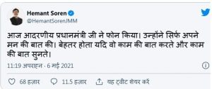 देश में कोरोना महामारी से कई राज्यों में स्थिति बिगड़ी हुई है। ऐसे में अब गैर भाजपा शासित राज्य केंद्र पर भेदभाव करने का आरोप लगा रहे हैं। गुरुवार को झारखंड के सीएम हेमंत सोरेन की प्रधानमंत्री नरेंद्र मोदी से बातचीत हुई। सोरेन ने इसके बाद एक ट्वीट किया, जिस पर बवाल हो गया है। सोरेन ने कहा कि प्रधानमंत्री ने सिर्फ अपने मन की बात की। बेहतर होता यदि वे काम की बात करते और काम की बात सुनते।