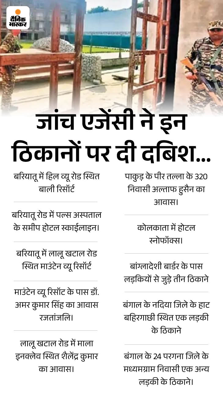 अब तक की जांच में ED को पता चला है कि बरियातू क्षेत्र के कई रिसॉर्ट व होटल बांग्लादेशी लड़कियों को रखने के ठिकाने बन गए हैं। इन लड़कियों को दलाल देह व्यापार के लिए रांची लाते हैं। ये होटल और रिसॉर्ट ऐसी गलियों में हैं, जहां आम आदमी या पुलिस कम ही जाती है। इसलिए दलाल इसे सुरक्षित जगह मानते हैं। छापेमारी के दौरान जांच एजेंसी ने रिसॉर्ट के रजिस्टर को खंगाला। स्टाफ से पूछताछ की। अब ईडी पूछताछ के लिए रिसॉर्ट मालिकों को जल्दी ही समन भेजेगी।