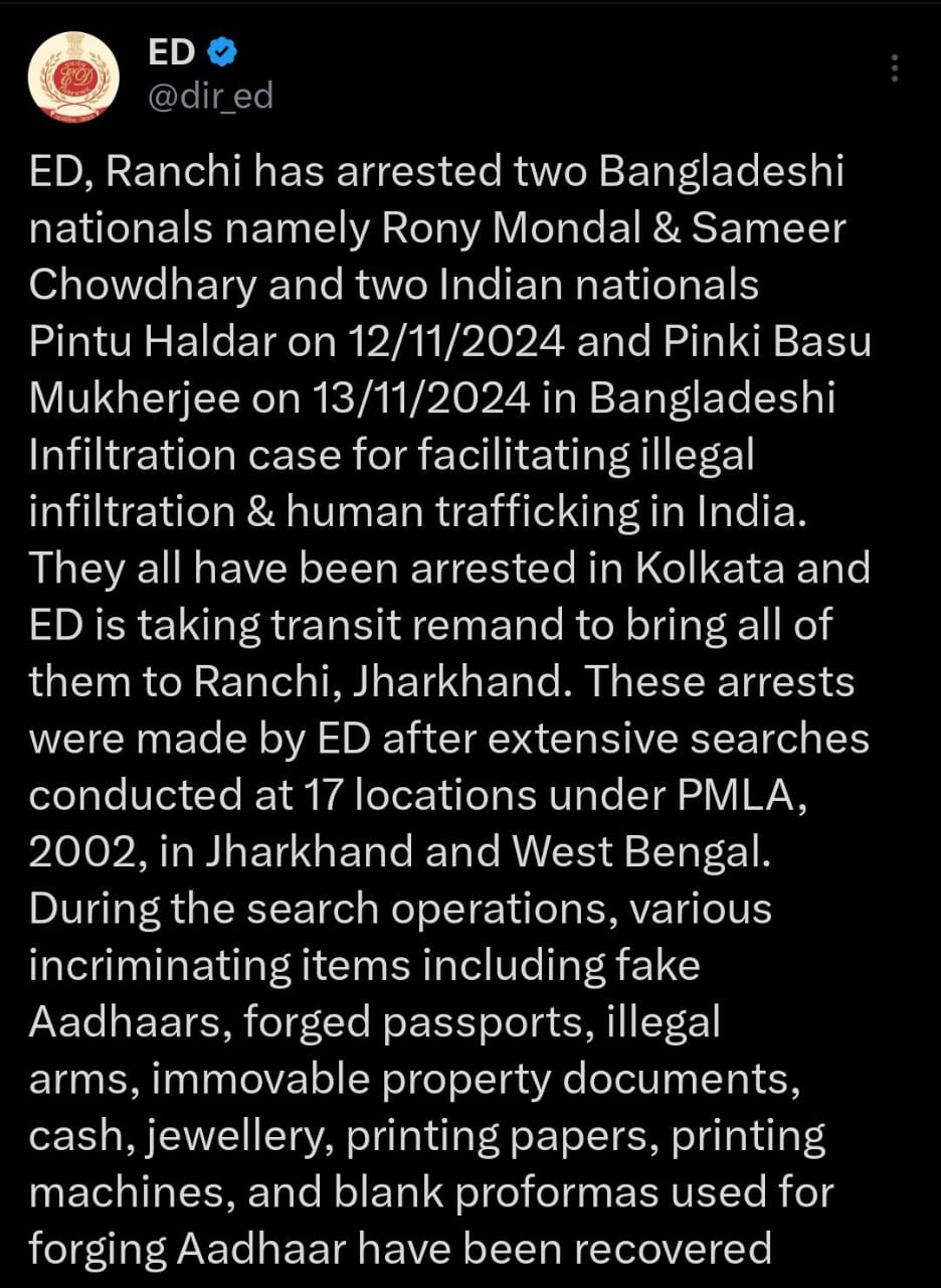 बांग्लादेशी घुसपैठ मामले में प्रवर्तन निदेशालय (ED) ने चार लोगों को गिरफ्तार किया है। इनमें बांग्लादेशी नागरिक रानी मंडल और संदीप चौधरी और भारतीय नागरिक पिंटू हलधर व पिंकी बासु मुखर्जी शामिल हैं। चारों के पास से जब्त डिजिटल डिवाइस से मिली जानकारी के आधार पर एजेंसी विदेशी लड़कियों को मंगानेवाले बिहार, झारखंड और पश्चिम बंगाल के रईसों की तलाश कर रही है।