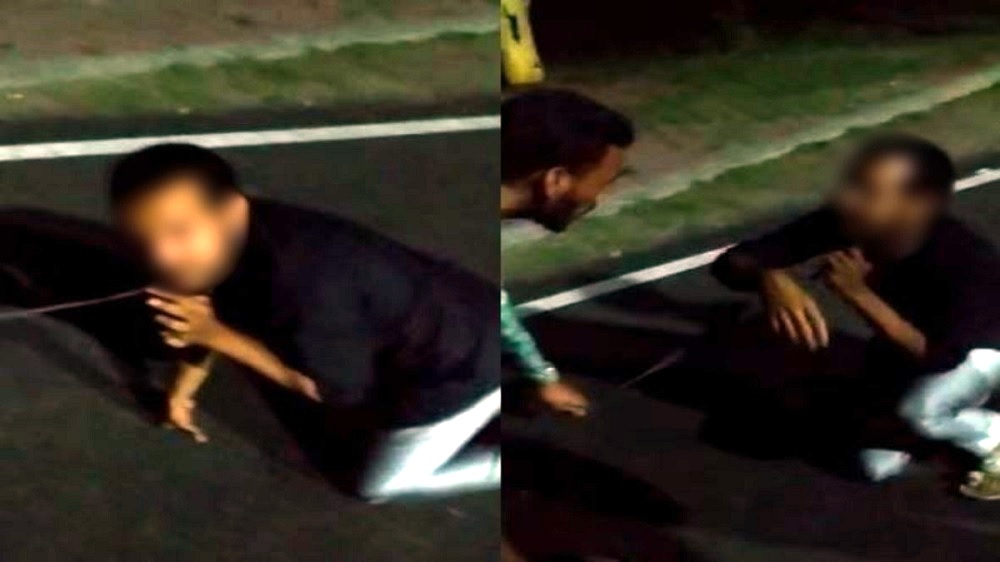 VIDEO में पीड़ित घुटनों के बल बैठा हुआ है। गले में पट्‌टा (बेल्ट) बंधा है। एक आरोपी बेल्ट खींचकर उसका गला कसते हुए कहता है- ‘कुत्ता बन, बोल भाई सॉरी…।’